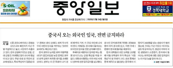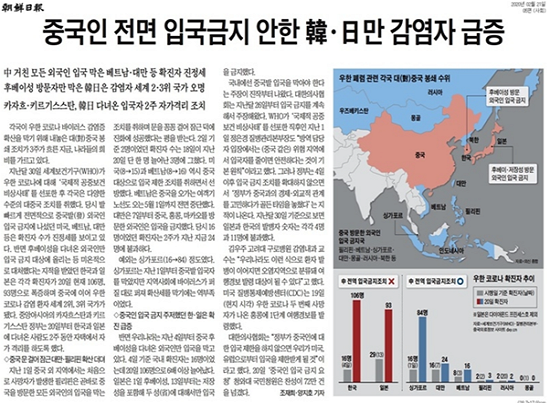 <중앙>은 2월 24일 1면 머리기사 ‘중국서 오는 외국인 입국, 전면 금지하라’에서 ‘신종 코로나바이러스 감염증(코로나19) 확진자가 지난 주말 폭발적으로 늘고, 사망자가 속출하고 있다’며 ‘중국 정부의 눈치를 보며 우물쭈물하다가 골든타임을 놓친 문재인 정부의 방역 실패가 혹독한 대가를 초래한 것’이라고 보도했다. <조선>은 이에 앞선 2월 21일 ‘중국인 전면 입국금지 안 한 韓·日만 감염자 급증’ 기사에서 ‘코로나19 발생 초기 중국에 대한 입국 금지를 한 나라 대부분은 확진자 수가 진정세를 보이는 반면, 한국과 일본은 감염자가 급증했다’고 보도했다.