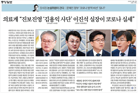 중국인 입국 금지 쟁점은 ‘범학계 코로나19대책위원회' 해체로 이어졌다. <중앙>은 3월 3일 ‘의료계 “진보진영 ‘김용익 사단’ 이진석 실장이 코로나 실세”’ 기사에서 비선 자문 의혹을 제기했다. 그들이 중국인 입국 금지 여론을 수렴하지 않아 방역에 실패했다는 논리를 내세운 것이다. 이 기사에서 최대집 대한의사협회장은 “이재갑 한림대 강남성심병원 감염내과 교수는 이진석 청와대 국정상황실장과 친하다고 들었다”며 “이 교수의 의견이 이 실장을 통해 대통령에게 전달됐을 수도 있다"고 말했다. 이 기사는 또 의료계 익명 소식통을 통해 “서울대 교수 출신인 김용익 건강보험공단 이사장을 정점으로 한 '의료 사회주의자'들이 대통령 주변에 포진해 코로나19 대응 과정에서 막강한 영향력을 행사하고 있다”고 했다.