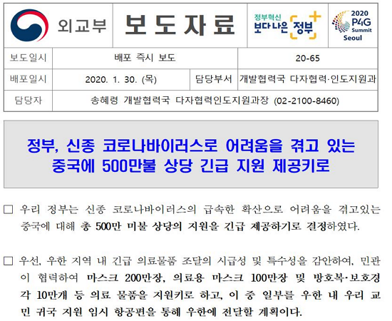 이런 보도는 실제 상황과 거리가 멀다. 이들이 근거한 것은 1월 30일 발표된 외교부 의료물품 지원계획이었다. 우한 지역에 마스크 200만장, 의료용 마스크 100만장, 방호복·보호경 각 10만개 등 의료물품을 지원하겠다는 것이다. 이 물품들은 '중국유학총교우회'와 '우한대총동문회'에서 제공한 것으로, 정부는 이 물품을 항공기와 대중교통이 차단된 우한으로 긴급공수할 수 있도록 지원했다. 민간 예산 물품을 정부가 '지원'했다는 것이다. 이러한 보도가 문제되는 이유는 사실 확인이라는 저널리즘 기본 원칙을 어겼을 뿐 아니라 우리 정부와 중국 정부의 관계를 악화시키려는 의도가 있기 때문이다. 이를 두고 박홍원 교수는 “현 정부가 중국에 저자세를 취한다’는 주장과 연결 짓기 위한 악의적 보도 행태”라고 지적했다.