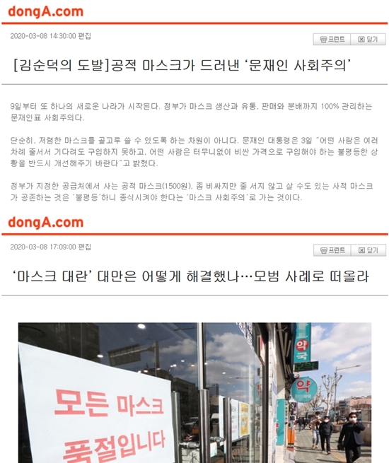 정부를 비판하려는 의지가 강한 나머지 이중 잣대를 들이대 논조가 혼선을 빚기도 했다. <동아일보>는 위 칼럼에서 마스크 수급시장에 정부가 개입한 것을 근거로 ‘사회주의’라 비난했지만, 다음 날 ‘‘마스크 대란’ 대만은 어떻게 해결했나…모범 사례로 떠올라’ 기사에서는 마스크 생산량을 조절한 대만 정부를 높이 평가했다.