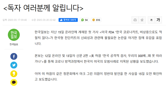 이 보도는 오보였다. 당장 그 청문회에서 로버트 레드필드 미국 질병통제예방센터장이 "한국 방식은 분자 진단법, 그린 의원이 언급한 내용은 혈청학적 진단법"이라며 그린 의원의 그릇된 지식을 바로잡는 내용이 이어졌음에도 기사에는 그린 의원의 문제제기 부분만 잘라 인용한 것이다. 또 <한국>은 이를 근거로 같은 날 ‘미국 FDA 뭐라고 하든… 정부 “국내 진단키트 정확성 확신”’이라는 기사를 내며 정부를 비판했다.