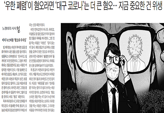 <중앙>은 2월 29일 칼럼 ‘바이러스의 은유’에서도 특정 지역 이름을 쓰면 혐오가 생기며 이는 전염병보다 감염성이 더 크다고 지적했다. ‘우한 폐렴’ 명칭이 지역 혐오를 부추긴다는 WHO 권고에 따른 정부를 중국 눈치 본다고 비판하던 보수언론은 ‘대구 코로나19’라고 실수한 부분에서는 반대로 대구 혐오를 부추긴다고 비판한 것이다.