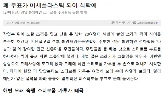 <단비뉴스> 환경부는 ‘에너지 대전환, 내일을 위한 선택’ 시리즈에 이어 ‘미세먼지’, ‘해양 쓰레기’, ‘플라스틱’ 등 환경문제를 지속적으로 다뤄왔다. 지난 12월 출고된 <폐 부표가 미세플라스틱 되어 식탁에> 기사로 경남 통영의 ‘해양 쓰레기’ 실태를 담은 이정헌 기자를 만나봤다. 아래는 대담 내용 전문이다.
