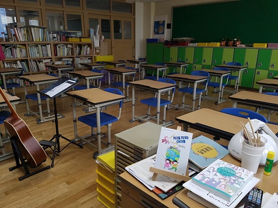 코로나19가 좀처럼 수그러들지 않는다. 3월 9일 → 3월 23일 → 4월 6일 → 4월 16일. 네 차례나 개학이 미뤄진 뒤 아버지는 학교로 돌아갔다. 23명 아이들이 마구 떠들고 있어야 할 교실은 조용하다. 대신 아이들이 바라봐야 할 TV 모니터가 아이들 얼굴로 가득하다. 아버지가 아끼는 기타만 덩그러니 텅 빈 책상들을 바라본다.