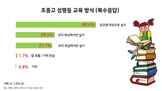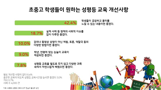 성교육과 성폭력 예방 교육을 포함한 성평등 교육의 내용도 유사하고 기초 수준인 것이 많아 부실하다는 지적도 나왔다.