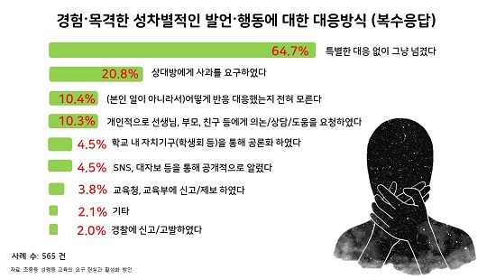 학교생활을 하면서 성차별을 경험하고도 제대로 대응하지 못했다는 응답자도 64.7%에 이르렀다. 대응을 했다는 학생들은 상대방에게 직접 사과를 요구한 경우는 20.8%였고, 개인적으로 선생님이나 부모님, 친구 등에게 도움을 요청한 경우가 10.3%였다. 대외적으로 공론화할 때는 학생자치기구와 SNS, 대자보를 통해 알린 경우가 각각 4.5%, 교육청에 신고 또는 제보한 경우가 3.8%, 경찰에 신고 또는 고발한 경우가 2.0%에 그쳤다.