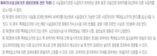요양원으로 돌아와서 보니 못 보던 노인이 새로 들어와 있어 간호조무사에게 물었더니 자신이 입원하면서 생긴 빈자리에 들어온 특례입원자라고 했다. 노인복지법 장기요양급여 제공기준 제46조는 ‘수급자(요양원 입원자)가 10일을 초과한 외박을 하면 1명을 특례 입소시킬 수 있다’고 돼 있는데, 그 규정에 따라 한 사람을 더 받았다는 것이었다.