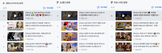 <뉴팡!> <YO! 너두> <페이스아이디>가 세로형 스크린을 활용한 결과는 조회 수 추이로 나타난다. 세 프로그램은 카카오TV 오리지널 콘텐츠 공개에 따른 컨벤션 효과를 누리며 첫 화에서 60만 안팎의 많은 조회 수를 기록했다. 세로 화면을 적절하게 활용한 <페이스아이디>가 조회 수를 유지하는 사이, <뉴팡!>과 <YO! 너두>는 조회 수가 절반 가까이 떨어졌다.