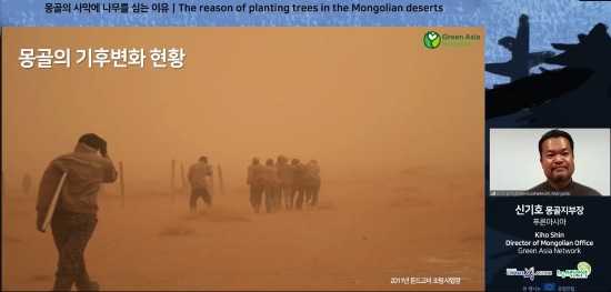 신기호 푸른아시아 몽골지부장은 ‘몽골의 사막에 나무를 심는 이유’ 발표에서 몽골의 기후변화가 한국에 미치는 영향을 설명했다. 신 지부장은 “기후위기로 몽골의 기온상승과 사막화가 빠른 속도로 진행되고 있다”며 “한국에서는 먼 나라 이야기처럼 들리겠지만, 한국에서 발생하는 황사의 발원지는 대부분이 몽골”이라고 말했다. 그는 몽골의 사막화, 수도권 인구 집중, 기후난민 등을 들어 기후위기의 심각성을 강조하면서 ‘몽골 사막에 왜 나무를 심는지’ 답했다.