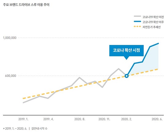 코로나19 이후 드라이브스루의 비대면 방식은 소비자 편의를 넘어 감염 위험을 최소화하며 서비스를 즐길 수 있는 하나의 문화로 자리잡고 있다. ‘T map Trend Map 2020’에 따르면 2019년 한 해 동안 드라이브스루 매장을 찾은 이동량이 약 1.5배 증가했다. 2020년 1월까지 상승세를 보이다 확진자가 폭발적으로 증가하던 2월에는 이용 감소세를 보였지만 강력한 사회적 거리두기를 실천한 3월부터 이동량이 다시 상승했다. 드라이브스루는 신체적으로 거리를 두며 일상을 즐길 수 있는 한 줄기 빛이지만 그림자도 존재한다.