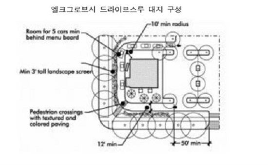드라이브스루를 처음 도입한 미국은 어떻게 이런 문제에 대처할까? 미국 캘리포니아주 엘크그로브시에서는 대기차선 구조와 보행자통로 구조 등을 명확하게 규정하고 있다. 주차 차량, 매장 진·출입 차량의 동선을 분리하고 폭을 최소 12피트(3.65m) 이상으로 둬야 한다. 또한 보행자통로도 대기차선과 교차하면 안 되며 가시성 확보를 위해 보행자 통로는 질감 있는 재료로 구분해 포장하도록 명시했다.