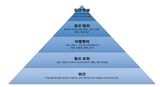 여성혐오뿐 아니라 이주민, 장애인, 노인, 성 소수자 등 사회적 약자를 대상으로 한 혐오와 차별이 전반적으로 증가하는 추세를 보이고 있다. ‘틀딱충’ ‘김치녀’ ‘짱깨’ 등 노골적인 혐오표현이 표현의 자유라는 이름으로 사실상 방치되고 있다. 코로나19 확산과 함께 중국 동포와 특정 종교집단, 성 소수자 등이 번갈아 가혹한 혐오의 돌팔매를 맞았다. 혐오는 ‘표현’에 그치지 않고 언제나 폭력으로 이어질 가능성이 있기에 방치해선 안 된다. <말이 칼이 될 때>의 저자 홍성수 교수는 ‘혐오의 피라미드’로 그 구조를 설명한다. 피라미드의 가장 아래 위치한 혐오는 조금 더 위에 있는 차별로 이어지고, 이 차별은 다시 폭력과 제노사이드(집단학살)로까지 비화할 수 있다는 것이다.