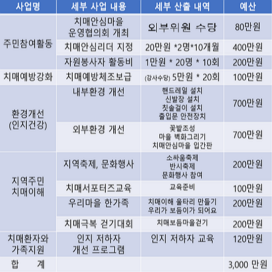 ‘인지건강을 위한 환경개선사업’ 명목으로 책정된 예산이 1400만원으로 전체의 절반에 가까운데, 내역을 보면 핸드레일 설치, 신발장 설치, 칫솔걸이 설치, 출입문 안전장치, 꽃밭 조성, 마을벽화 그리기, 치매안심마을 입간판 설치 등 전부 치매예방이나 환자 돌봄과 직접 관련은 없는 것들이다.