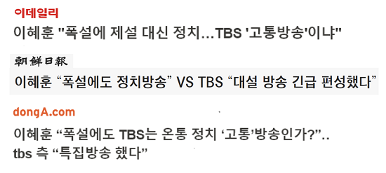 뉴스로 장사하는 세상입니다. 복사하기와 붙여넣기, 이 두 기능만으로 ‘팔리는’ 뉴스를 누구나 생산할 수 있습니다. 타사 기사, 보도자료는 물론이고 소셜미디어, 인터넷 커뮤니티 등에 게재된 내용을 사실 검증 없이 그대로 옮깁니다. 지난 7일 이혜훈 전 국민의힘 의원이 SNS에 교통방송인 TBS가 폭설 상황 관련 방송을 하지 않았다고 주장하는 글을 올렸습니다. <조선> <동아> <중앙> <이데일리> <데일리안>이 이 내용을 그대로 기사화했습니다. 그것은 사실이 아니었습니다. TBS는 6일 저녁 8시부터 새벽 3시, 7일 새벽 5시부터 7시까지 대설 특집 방송을 편성했습니다. 인용 기사에는 이 의원 말을 인용해 ‘폭설 대신 정치’ ‘’교통방송’인가 ‘고통방송’인가?’처럼 감정을 자극하는 제목까지 붙였습니다.
