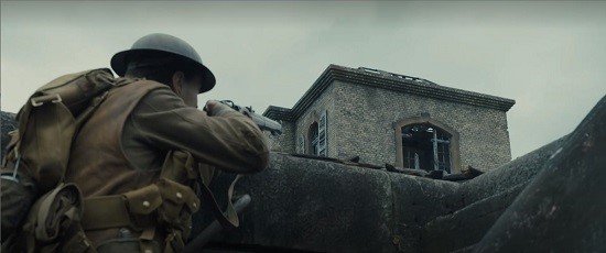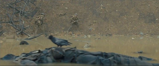 이런 특성이 잘 나타나는 장면은 독일군 참호에 들어가기 전 마지막 웅덩이를 건널 때다. 스코필드와 블레이크는 물을 피해 웅덩이를 곡선으로 건넌다. 이 모습을 카메라는 웅덩이 위에서 수평으로 이동하며 잡는다. 곡선과 직선이 만들어낸 반원의 공간에 인물들의 모습과 함께 웅덩이에서 썩어가는 시체와 그 위에 앉아있는 까마귀의 모습이 잡힌다. 인물의 행로를 단선적으로 따라가지 않아서 인물이 멀어진 공간에 죽음의 공포를 집어넣는 것이다. 전투 장면이 하나도 없는 전반부에서 감독은 이런 카메라 활용을 통해 관객들에게 본능적 긴장감을 제공한다.