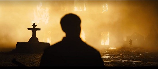 <1917> 미장센에서 빼놓을 수 없는 이미지가 있다. 불과 물이다. 삶과 죽음의 교차는 불과 물로 나타낸다. 흥미로운 것은 불과 물을 단일한 이미지로 사용하는 다른 영화와 달리, 불에도 물에도 삶과 죽음이 교차한다는 것이다. 통제할 수 없는 거대한 불은 죽음 이미지로 사용된다. 건물을 통째로 태우는 불의 이미지를 통해 파괴의 이미지를 덧입힌다. 불안감이 주황색이라는 불의 톤으로 표현되는 것이다. 특히 불타는 건물 옆에서 나타난 독일군은 불에 불안과 죽음이라는 감정을 직접 전이하는데, 이런 이미지 전이는 적이 쏘아 올린 조명탄의 주황색과 맞닿아 공포를 느끼게 한다.