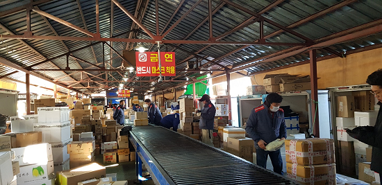 코로나 확산과 연말을 맞아 택배물량이 크게 늘어난 작년 12월 29일 오전 일곱 시, 충북 제천시 한 택배회사 집하장. 어둠이 가시지 않은 작업장은 분류작업을 하는 택배기사들의 손놀림으로 분주했다. 삼십명 가까운 기사들이 컨베이어 벨트 양쪽으로 늘어서서 벨트를 타고 흘러오는 택배상자의 주소를 확인해 자기가 담당할 물건을 골라내느라 숨돌릴 틈이 없었다.