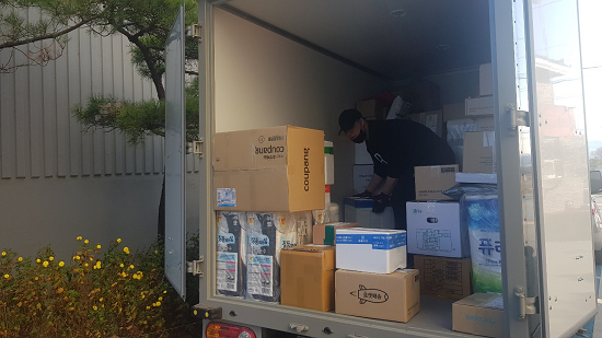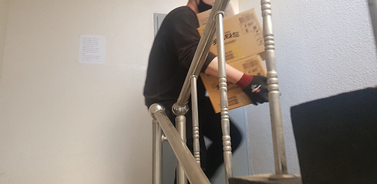 상가 두 곳을 들러 배송을 마친 하 씨는 아파트 단지로 이동했다. 그가 배송하는 아파트 단지는 청전동 현대아파트 2개 동과 고암동 금용아파트 3개 동 등 모두 5개 동 575세대를 혼자 맡고 있다. 그는 “‘언제 오느냐’는 문의 전화와 ‘왜 빨리 안 오느냐’는 항의 전화가 오기 전에 빨리 해야 한다”며 바삐 움직였다. 아파트 단지에 들어서 첫 번째 동 앞에 도착하자 그는 트럭 문을 열고 배송할 상자들을 다 꺼낸 뒤 다시 위층부터 순서대로 분류작업을 했다.