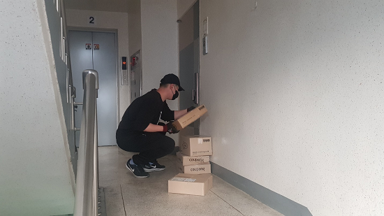 그는 수레에 상자들을 싣고 ‘경비실에 맡겨 달라’고 한 물건들은 경비실 앞에 내려 두고, ‘문앞에 놓아 달라’고 한 물건들을 싣고 15층으로 올라가 한 층씩 내려오면서 배송을 했다. 엘리베이터 문이 열리고 닫힐 때마다 종이 판지를 문틈에 끼워놓고 시간을 벌어 가면서 층마다 택배상자를 두고 내려왔다. 가끔 직접 수령하겠다는 집은 인터폰을 눌러 전해주었다. 아파트 단지 배송을 하다 보면 층을 잘 못 보고 다른 층에 배송해 물건 값 3만7천원을 물어준 적도 있다. 이렇게 두 개 아파트 단지에 100여개를 배송하는 데 두 시간이 좀 더 걸렸다.