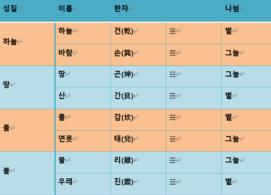 음과 양에 선악이나 우열이 없듯, 팔괘(八卦)도 모두 동등하며, 각각의 괘에는 고유한 미덕이 있다. 팔괘는 4원소설의 공기, 땅, 불, 흙을 각각 둘로 나눈 것이라고 보면 된다. 양효로만 이뤄진 건(乾)은 만물 위에 의기양양하게 떠 있는 하늘이며, 곤(坤)인 땅은 밑에서 받쳐주니 성질이 유순하다. 음이 양을 둘러싸고 있는 감(坎), 즉 물은 겉으로는 유순하나 태풍이나 홍수 때 보면 두려운 존재다. 불을 상징하는 리(離)는 감(坎)과 반대로, 양이 음을 감싸고 있는 형태다. 불은 겉은 냉정하게 타지만, 어딘가 기생하지 않으면 사라진다. 그래서 한비자는 물보다 불같은 지도자가 문제라고 했다고 한다. 또한 하늘이 밑으로 무너져서 내리는 게 바람이어서 건(乾)괘에서 맨 아래만 음이 손(巽)괘다. 산, 연못, 번개도 이런 식으로 설명할 수 있다. 자연에서 양 속에는 음이 있고 음 속에 양이 있는 성질을 찾는다. 이것이 음양대대다.
