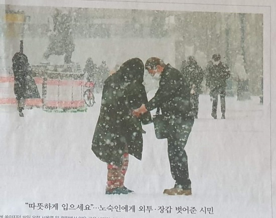 한파가 기승을 부리던 흰 눈 내리는 그날 아침, 추위와 허기에 기진한 노숙인이 행인에게 따뜻한 커피 한잔 사줄 수 없느냐고 물었다. 행인은 묵묵히 자신의 코트와 장갑을 벗어 노숙인에게 건넸다. 지갑에서 5만 원 지폐까지 꺼내 주었다. 기자가 이 광경을 목격하고 사진을 찍었다. 하얀 눈이 펑펑 쏟아지는 서울 도심에서 일어난 미담은 다음 날 아침 신문 1면을 장식했다. 새해에 마주한 감동이었다. 이 힘든 세상에 여전한 희망이었다. 그러나 감동과 희망은 이내 애틋함을 넘어 분노로 이어졌다. 미담에서 우리는 사람의 두 얼굴을 마주한다. 하나는 추위와 생계위협, 코로나감염에 노출돼 생존 위기에 맞닥뜨린 사회적 약자의 얼굴이었다. 이들은 절규했지만 우리는 이들의 절규를 듣지 않았다. 다른 하나는 서슴없이 자신의 코트와 장갑을 벗어주고 현금까지 건넨 개인의 얼굴이었다. 묻는다. 국가는, 정치는 어디서 무엇을 하고 있는가. 언제까지 구조적인 사회문제를 행정력과 법제가 아니라 개인의 미담으로 해결하려는가. ‘흰 눈 내리던 날, 그 코트와 장갑’은 오늘 한국 사회의 가치와 질서, 삶의 양식을 있는 그대로 드러낸다. NCCK 언론위원회가 “흰 눈 내리던 날, 그 코트와 장갑”을 이달의 <주목하는> 시선으로 선정한 이유다.