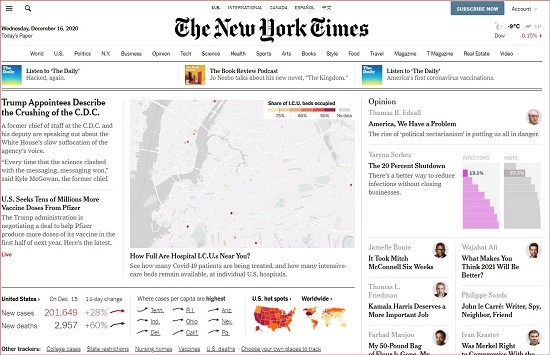 ‘디지털 퍼스트(Digital First)’는 디지털 혁신을 시도하는 국내외 언론이 공통으로 외치는 구호였다. 전통 신문사였던 〈뉴욕 타임스〉는 전세계적으로 디지털 혁신에 성공한 대표적인 사례로 꼽힌다. 돈을 지불해야 콘텐츠를 볼 수 있는 ‘디지털 유료화 전략’이 성공한 덕분이다. 지난해 8월 디지털 매출은 종이 신문 매출을 추월했다. 2020년 2분기 디지털 매출이 1억8천550만 달러(약 2천204억 원)로 신문 매출 1억7천740만 달러(약 2천14억 원)를 넘겼다. 3분기에는 온라인 구독자가 39만3000명 늘어나 전체 온라인 구독자 규모가 600만 명을 넘기도 했다. 2011년 디지털 콘텐츠를 유료로 전환한 뒤 9년 만에 이뤄낸 성과다. 〈뉴욕 타임스〉의 연간 보고서를 보면 연간 수입은 2011년 약 15억 5400만 달러에서 2019년 18억 1200만 달러로 증가했다.
