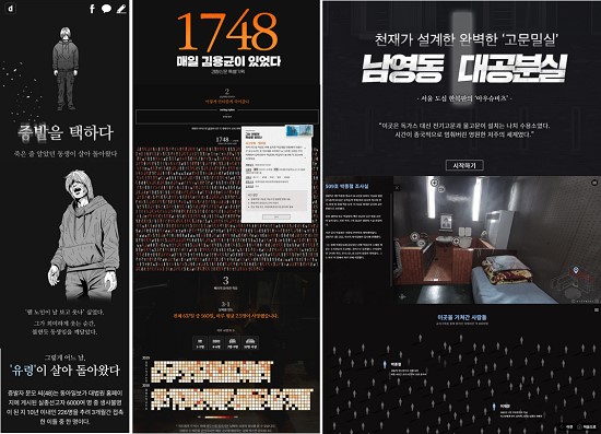최근의 눈에 띄는 사례들을 보자. 〈동아일보〉가 선보인 기획보도 “증발을 택하다”는 독립적인 웹페이지를 개발한 점은 여타의 인터랙티브 뉴스와 유사하지만, 모바일에 특화한 포맷을 취하고 있다는 것이 특징이다. 〈경향신문〉에서 제작한 “매일 김용균이 있었다”와 〈한국일보〉의 “남영동 대공분실” 등은 디지털 아카이빙의 성격을 가지고 있어, 지속적인 독자 유입도 기대해볼 수 있다. 〈SBS〉는 데이터저널리즘에 주력하는 “마부작침” 팀을 두고 지속적으로 콘텐츠를 제작하고 있고, 〈KBS〉와 〈MBC〉 역시 뉴스 웹사이트에서 데이터와 멀티미디어를 활용한 ‘인터랙티브 보도’를 이어가고 있다.