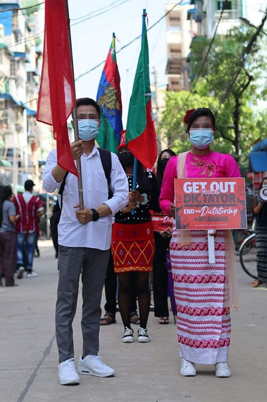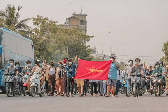 ▲4월 10일 만달레이 대학생 협회 시위대는 체포된 이들의 석방을 탄원하며 군사 독재의 퇴진을 요구했다. 이들이 든 깃발은 대학생 협회를 대표하는 깃발로 전국에서 사용 중이다. 붉은 바탕에 그려진 노란색 새가 원 안에서 날아오르려고 준비하는 듯한 모양이다.