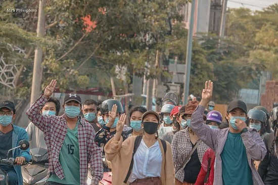 ▲4월 10일 만달레이 대학생들이 가두시위를 벌였다. 만달레이는 미얀마의 제2도시로 만달레이 외국어 대학교 등 많은 대학들이 이 곳에 있다. 쿠데타가 터진 직후인 2월 4일 처음 가두시위에 나선 것도 만달레이의 대학생들이다. 군부가 이들을 강경 진압한 뒤부터 본격적인 민주화 항쟁이 시작됐다. 사진 속 학생들은 미얀마 군부 독재를 향한 저항의 상징이 된 ‘세 손가락 경례’를 하며 행진 중이다. 대부분의 학생들이 안전모나 오토바이 헬맷 등을 써서 머리를 가리고 있다.