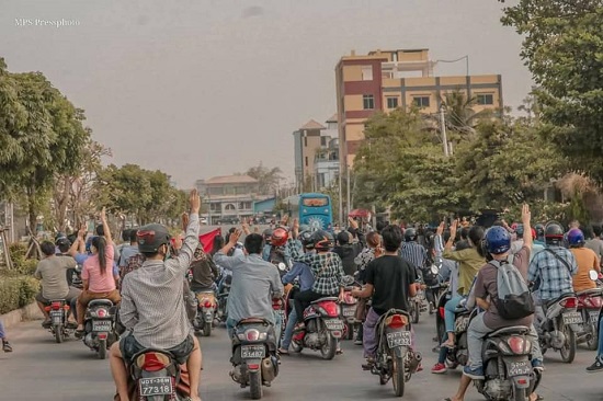 ▲만달레이 대학생들이 오토바이를 타고 시위를 벌이고 있다. 오토바이는 미얀마나 베트남 등 동남아에서 아주 유용한 교통수단이다. 미얀마 양곤의 경우 오토바이의 도심 진입을 법으로 막고 있지만 다른 지역에서는 오토바이를 자유롭게 탈 수 있기 때문에 시위 수단으로 이용되기도 한다.