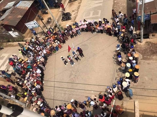▲4월 8일 사가잉 지역의 칸발루 마을에서도 파업을 했다. 미얀마 북서부 사가잉 지역은 만달레이에서 남서쪽으로 20km 가량 떨어져 있다. 이곳은 수도원의 중심지로 미얀마의 국교인 불교 수도원들이 많이 있다. 사진 속 집회 참여자들의 대부분은 여성인데, 도보 시위 중인 이들도 오토바이 헬맷 등 머리를 보호하는 장구를 착용하고 있다.