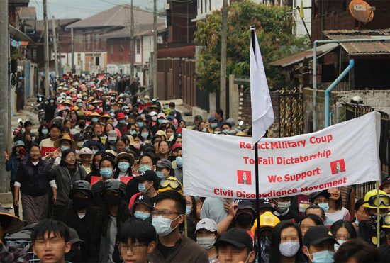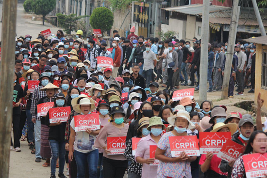 ▲4월 5일 세계 최고의 루비 산지인 모곡의 시민들이 행진하고 있다. 피켓에 쓰인 ‘CRPH(연방의회 대표위원회)’는 아웅 산 수치 전 국가고문이 이끌던 민주주의민족동맹(NLD) 소속 정치인들이 중심이 되어 2월 5일 창립한 조직이다. 시사 미얀마 연방의회 대표위원회 유엔 특사는 KBS와의 인터뷰에서 CRPH가 국제 사회에서 미얀마 의회를 대표한다고 말했다. 이들은 민 아웅 흘라잉 군 최고사령관이 쿠데타로 집권한 후 구성한 내각의 정당성을 부정하고 있다. CRPH는 아웅 산 수치가 이끌던 정부의 공식 임기가 만료되는 4월 1일 국민통합정부를 새로 출범시켰다. 한편 군부는 CRPH에 반역죄를 적용했다.