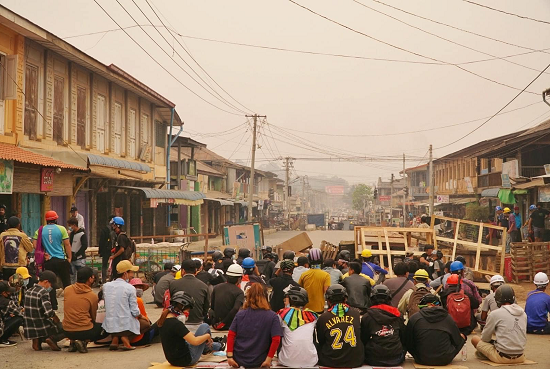 ▲4월 4일 미얀마 북동부 샨주(州) 차우크메 타운 사람들이 바리케이드를 설치하고 군경과 대치중이다. 시민들은 스스로를 보호하기 위해 모래주머니나 가구 등을 끌어모아 바리케이드를 치고 있다. 바리케이드는 군경의 총격을 막아주거나 진압 시 시위대에게 시간을 벌어주는 역할을 한다. 군경은 집에 있는 다른 시민들을 강제로 징발해 이런 바리케이드를 일일이 치우도록 만든다.