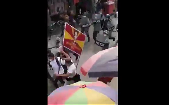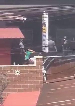 ▲군경은 시위대뿐만 아니라 길거리를 지나는 젊은 청년들을 붙잡아 무릎 꿇리고 걷어차고 폭행한다. 이 사진은 영상 스틸 사진으로 원본 영상은 누군가가 자신의 집에 숨어서 몰래 촬영한 것으로 보인다. 화면이 흔들리고 초점이 잡히지 않지만 군경의 폭력성이나 상황의 긴박함을 잘 전달해주고 있다.