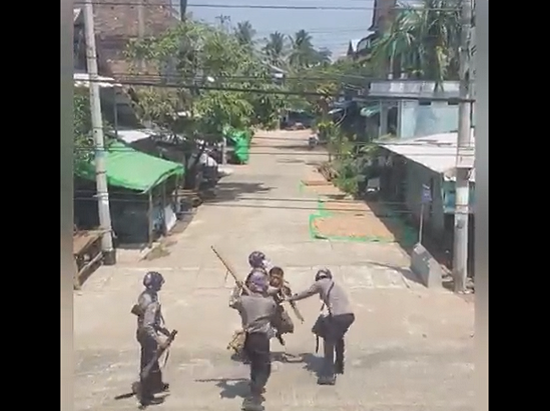 ▲한 젊은 남성의 목을 조르며 끌고 가는 군경들이 막대기로 그의 팔과 다리, 머리 등을 구타하고 있다. 미얀마에서는 약 700여 명 이상이 군경의 폭력으로 사망했다. 부상자는 집계되지 않고 있다. 체포된 사람도 수천여 명에 이르며 끌려간 후 생사가 불분명해진 경우도 많다.