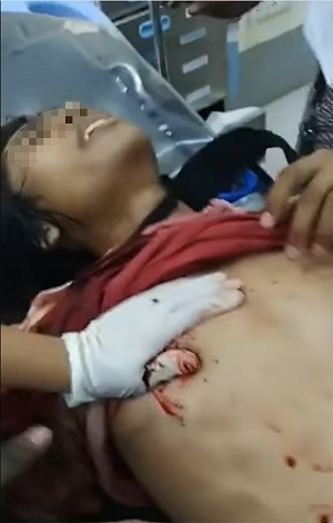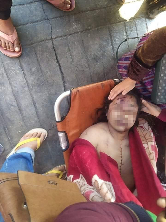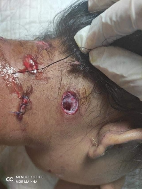 ▲따닝나이주 베이시에서 고무탄에 맞아 부상을 입은 여대생의 사진이다. 상처를 봉합한 흔적과 머리 뒤쪽에 동그랗게 난 상처가 보인다. 이 사진은 고무탄도 살상이 가능하다는 점, 그리고 군경이 시위대의 머리와 상체를 향해 발포하고 있다는 점을 여실히 드러내고 있다.