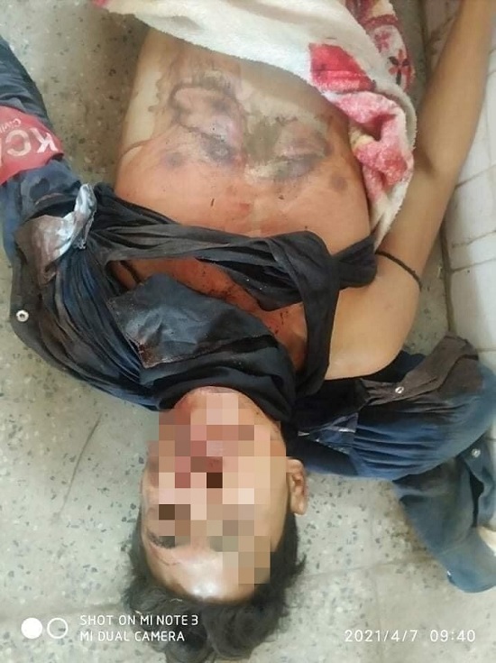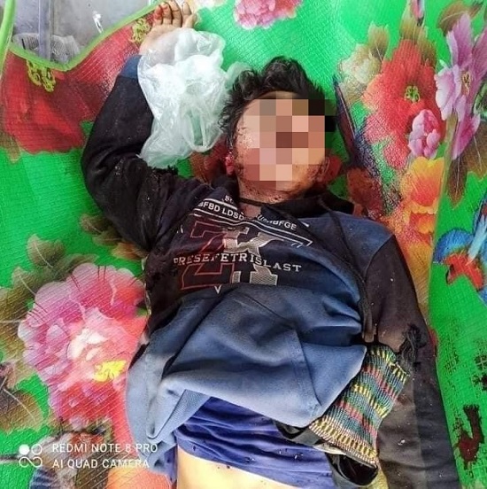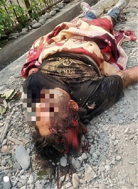 ▲만달레이에서 남서쪽으로 약 20km 떨어진 사가잉 지역, 칼레이 마을에서 4월 7일 오전 5시께 미얀마 군경이 시위대에 마구잡이로 총격을 가해 8명이 사망했다. 당시 시위대는 군경 진입을 막기 위해 마을 입구에 바리케이드를 쌓던 중이었다. 사진은 당시 숨진 이의 주검인데 머리에 총탄을 맞아 사망해 뇌수가 흘러나와 있는 상태다.