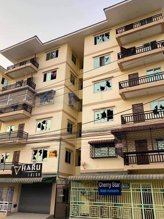▲만달레이 주택가의 부서진 유리창들. 실내도 안전하지 않다. 군경이 집 안까지 쫓아와 사람들을 죽이고 약탈을 일삼는 것으로 알려졌다. 3월 23일 만달레이에서는 아버지의 품에 안겨있던 6살짜리 여자아이가 집까지 쳐들어온 군경의 총에 맞아 목숨을 잃기도 했다.