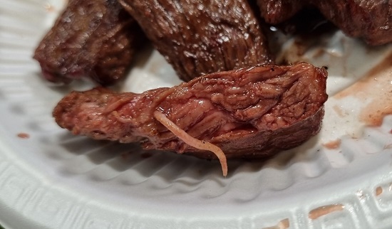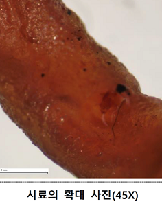 “한 덩이의 고기를 구워 가위로 자르는 순간, 고기 단면에서 무엇인가 쑥 튀어나왔다”고 A씨는 당시를 기억했다. 그는 20일 <단비뉴스>와 전화 통화에서 “가늘고 긴 기생충처럼 보이는 이물질이었다”고 말했다. <사진1>은 당시 A씨가 촬영한 것이다. 누구라도 기생충이라 의심할 만한 형태다. 특히 가늘고 원통형인 ‘선충’(roundworm)의 모습을 닮았다.