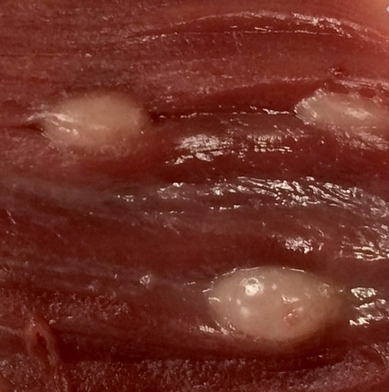 <사진4>는 소의 근육에 기생하는 무구조충의 애벌레다. 이 애벌레는 지름 1cm 안팎의 투명한 주머니 형태를 보인다. 이 기생충은 육안으로도 발견할 수 있다. 소고기를 날로 먹거나 덜 익혀 먹으면, 애벌레가 죽지 않고 인체에 들어오면서 감염된다. 이번에 발견된 소고기의 이물질이 혹시 무구조충은 아닐까?