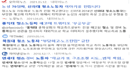 청소노동자의 집단해고는 LG트윈타워만의 문제가 아니었다. 최저임금에도 못 미치는 임금을 받던 홍익대 청소노동자들이 노동조합에 가입하자, 용역업체 변경을 핑계로 집단해고 당했다. 부산 신라대학교 청소노동자도 학교 측과 단 한 차례의 협의도 없이 집단해고 당했다. 대전 목원대학교 청소노동자들은 용역업체가 변경되어 해고를 문자로 통보받았다. 학교 재정이 어려워졌다는 이유였다. 우리 사회의 비정규직은 저임금에 시달리다가 가장 먼저 해고당한다.