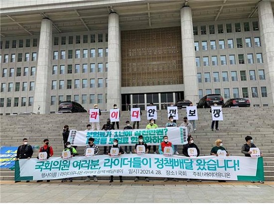 라이더 개인이 보험을 들기도 어렵다. 30대 무사고 기준 이륜차 보험료는 1년에 3백만 원 정도다. 20대는 6백만~7백만 원까지 올라간다. 대인배상과 대물보상 용도이고, 본인이 다치는 것은 제외하는 데도 그렇다. 라이더들이 감당하기 어려운 부담이다. 라이더유니온은 지난 4월 28일 국회에서 ‘정책배달’ 행사를 열고 ‘안전배달료 도입’ ‘배달대행사업 등록제 도입’ ‘플랫폼 갑질 규제’ ‘오토바이 보험료 현실화’ ‘공정하고 투명한 알고리즘 시스템 도입’ 등을 요구했다.