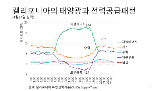 석 위원은 미국 캘리포니아의 사례로 들어 “원전은 유일하게 재생에너지 발전량에 따른 신축적 공급조절이 불가능하다”고 말했다. 태양광 발전량이 많은 낮 시간대에 원전의 전력 공급을 줄이지 못해 전력과부하로 다운(비상정지)이 일어나면 대규모 정전이 발생할 가능성도 있다는 설명이다. 석 위원은 “결국 캘리포니아는 미국에서 제일 비싼 원전인 ‘디아블로 1·2’를 수명연장 없이 조기폐쇄하기로 결정했다”고 전했다. 설계수명 40년인 디아블로 1·2기는 각각 2024년과 2025년까지만 운영되고 폐로 절차에 들어간다.
