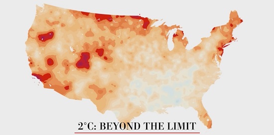 <워싱턴포스트>가 밝혔듯이, 지난 5년간 이미 지구 표면의 10%는 2도 이상 상승했고, 1.5도 이상 상승한 지역은 20%에 육박한다.'2℃'는 레드라인이다. 지구 평균 온도가 넘어선 안 될 선이다. 2015년 파리협정 이후 '2℃'는 전 지구적 목표가 됐다. 지구의 평균 온도 상승 폭을 2도 아래로 유지하고 1.5도를 넘지 않도록 노력하자는 것이다. 기준점은 산업화 이전(1850~1900년)이다. 2018년 10월 인천에서 열린 기후변화에 관한 국제협의체(IPCC) 총회에서는 '지구온난화 1.5℃'라는 보고서를 채택했다. 세기말까지 지구 온도 상승 폭을 산업화 이전에 견줘 1.5도 이내로 억제하지 않으면 돌이킬 수 없는 위험이 닥칠 것이라고 경고했다.