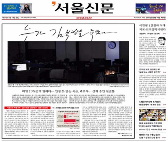 <서울신문>은 여전히 노동과 과로 문제에 관심이 많은 듯하다. 지난해에는 산재 야간 노동자의 과로사 등 부고를 모은 인터랙티브 <당신이 잠든 사이-달빛 노동 프로젝트>를 내놓기도 했다. “누구나 알고 있는 직장 내 과로 문제를 깊이 파고들어 폭발적 공감을 불러일으킨 시리즈”라는 2017년 한국기자상 심사위원단의 평처럼, 과로 문제는 누구나 알고 있는 문제다. 그러나 너무 익숙해져 고치기 힘든 한국 사회의 고질병이기도 하다. 고질병을 치료할 수 있는 가장 좋은 처방은 끊임없는 관심과 치료 시도다. 한국 사회에 수많은 ‘김부장’이 여전히 남아있다는 걸 세상에 외치고 실효성 있는 해결책을 파고드는 보도가 더 필요하다.
