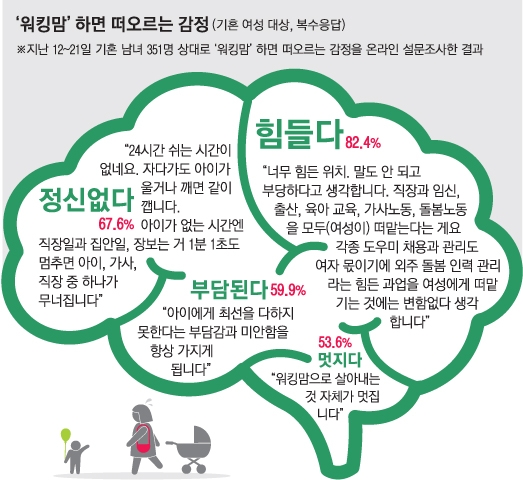 <서울신문> 특별기획팀은 회사 업무와 가사노동 시간을 합치면 주당 60시간이 넘어가는 워킹맘을 ‘시간거지’라고 표현했다. 시간이 너무 없어 구걸할 정도라는 것이다. <서울신문>은 기혼 남성 129명과 기혼 여성 222명을 직접 설문하고 심층 인터뷰해 경제활동과 독박육아, 집안일까지 책임져야 하는 워킹맘의 현실을 짚었다. 특히 자녀 양육과 집안일을 전담하는 ‘전업대디’를 향한 엇갈리는 시선을 보도한 점은 신선했다. 남성 응답자가 전업대디에게 느끼는 감정은 ‘부러움’이 11.6%로 가장 많았다. ‘부럽다’고 답한 남성들은 “여유롭게 살 것 같다”고 답했다. 반면, 여성 응답자는 ‘불안함(18.0%)’을 가장 많이 느꼈다.