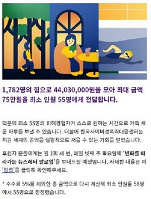 <내가 만드는 하루>는 디지털 성폭력 피해자가 자신이 원하는 하루를 만들어갈 수 있도록 지원하는 일상 회복 프로젝트다. 닷페이스는 먼저 피해자에게 필요한 지원을 하기 위해 기존 피해자 지원 정책의 문제점을 분석했다. 디지털 범죄의 특성상 가해자가 많아 특정하기 어렵고, 특정한다고 해도 개인정보 유출 등의 이유로 민사상 손해배상 청구도 쉽지 않다. 정부의 피해자 지원도 피해자를 부양할 수 있는 가족이 없을 때만 3개월 동안 매달 50만 원씩 지급하는 데 그친다. 피해가 오래 지속되는 디지털 성착취 범죄를 고려하면, 피해자들이 ‘자신이 원하는 하루’를 만들기엔 턱없이 부족한 지원이다. 닷페이스는 기사를 내보내며 취지에 공감하는 사람들의 후원을 받기로 했다. 후원자들에게는 후원금 전달 내역, 피해경험자의 일상 회복 과정, 일상 회복 프로젝트 보고서 등 프로젝트 전반적인 과정을 담은 뉴스레터를 세 차례에 걸쳐 발송했다. 15일간 진행된 펀딩에는 1782명이 참여했고 총 4400여만 원을 모아 최대 75만 원의 금액을 피해자들에게 전달했다.