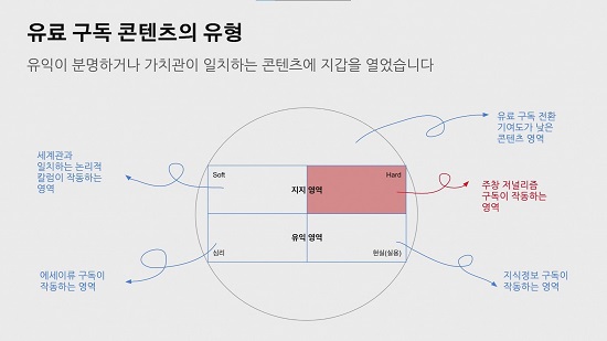 이러한 질적 지표는 수용자의 관여(engagement)와 연관된다. 주로 콘텐츠의 질이 영향을 끼친다. 그동안의 데이터를 바탕으로 보면, 유익하거나 가치관이 일치하는 콘텐츠를 볼 때 수용자들이 지갑을 연다고 이 대표는 말했다. 이 대표는 수용자에게 지식정보를 제공하거나 심리적 결핍을 해소해주는 콘텐츠를 ‘유익 영역’으로 분류했다. 수용자의 가치관과 세계관을 지지하거나 이와 관련한 주장을 펼치는 칼럼 등은 ‘지지 영역’으로 봤다. 수용자의 지갑을 열게 만든다는 점에서는 공통적이지만, ‘유익 영역’과 달리 ‘지지 영역’의 주창 저널리즘은 신뢰받는 저널리즘 생태계를 파괴한다고 이 대표는 설명했다.