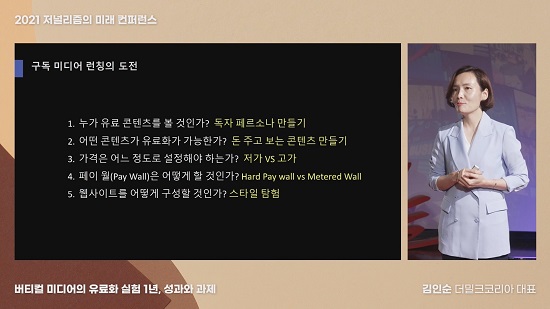 이성규 대표가 이끄는 <미디어스피어>는 국내 언론업계의 어벤저스로 평가받는다. 한국에선 보기 드문 디지털 구독 플랫폼 ‘블루닷’을 실험했다. 이 대표는 ‘한국형 미터드 페이월의 실험’을 주제로 발표하면서, 구독모델을 성공적으로 안착시킬 방법을 조언했다.
