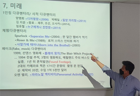 장해랑 교수는 “다큐멘터리 장르는 현실 변화에 따라 새로운 형식을 만들 것이고 실험을 멈추지 않을 것”이라고 전망한다. 그런 변화에도 “다큐의 정신 즉, 진실을 기록한다는 것은 지속해야 한다”고 강조한다. 그는 이 시대에 진정한 저널리즘이 회복해야 할 가치로 다큐멘터리의 사실주의, 기록정신, 진실추구 자세를 든다. 그 안에는 사람이 존재해야 한다. 그가 이 시대야말로 진정한 다큐멘터리의 시대가 돼야 한다고 믿는 이유다. 그는 <아웃 마이 윈도우>(2010)의 감독 캐터리나 시젝의 말로 다큐멘터리의 미래와 저널리스트의 다큐정신 실천을 강조하며 강의를 끝냈다.